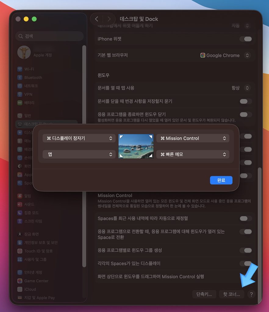 방법은 [설정] – 사이드바에서 [데스크탑 및 Dock] – 맨 밑에 [핫코너] 로 들어가면 됩니다 🙂